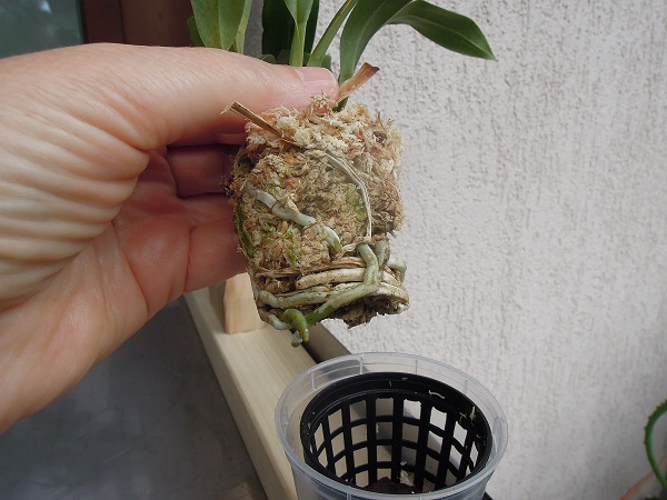 Kořeny vypadají dobře. Kytka má být sice víceméně vlhká, ale to sphagnum je možná moc. Já bych ji dala do směsi kůry a mechu, aby to bylo přece jen vzdušnější. Tohle mi přijde moc mokrý. Třeba někdo přidá svůj názor, ale mně přijde fakt moc mokrá. Nebo možná nedávat ten košíček do květináče