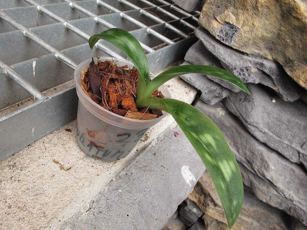 Paphiopedilum purpuratum je bez kořenů.Trošku mě mate –nemá moc výraznou kresbu na listu-no uvidíme. Moje "docela" osvědčená metoda(každý se časem dopracuje ke své vlastní)je okno na východ v kuchyňi sáček v něm rašeliník a na tom trůní pafíčko.V noci při poklesu teplot otevřít sáček ve dne zavřít(možná je to i opačně