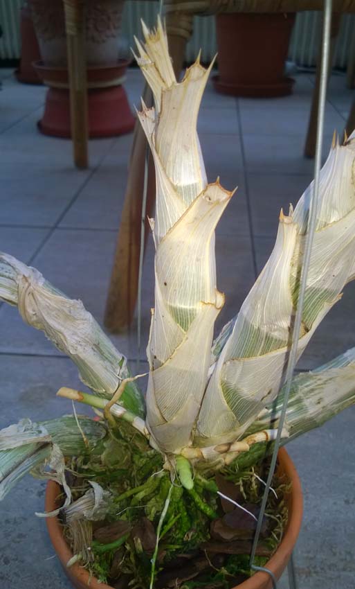 Zdenka: Já vždy myslel, že se bude samo rozrůstat postupně z více vrcholů, což se ale nestalo. Tím, že rostlina stále kvete nebo tlačí květní stvol tak jsem ji nechtěl oslabovat. Navíc si myslím, že ta poslední pahlíza je již vyžilá a asi by těžko obrazila. Chtělo by to alespoň poslední dvě, nebo ideálně 3 na 3. K tomu jsem se ale nikdy neodhodlal. Před asi třemi lety jsem udělal chybu. Moc jsem zaléval a rostlina přišla o část kořenového systému a zároveň shodila několik starých pahlíz. Teď již zalévám opatrně a mám ji v keramickém květináči v kůrovém substrátu. Postupně se vzpamatovala a ještě ji nějaký ten rok nechám a doufám, že pak bude silnější k případnému dělení.