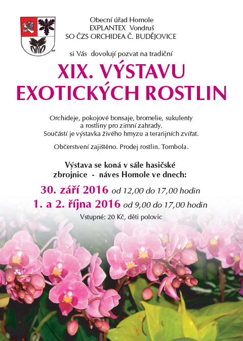 • Výstavu orchidejí a dalších exotických rostlin (19. ročník) v sále hasičské zbrojnice v Homolích u Českých Budějovic v době od 30.9. do 2.10. 2016.