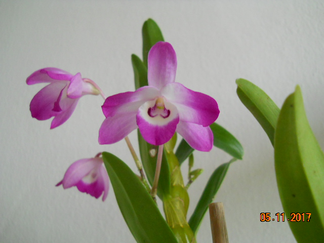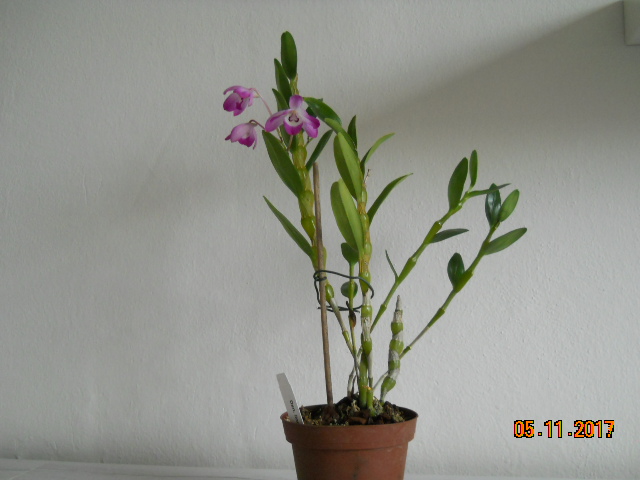 Dendrobium linawianum - nový přírůstek, rostlinu jsem pořídila s květním pukem. Ale myslím, že stojí za předvedení, navíc je to docela teplá kytka, do bytu se hodí. I pahlíza rostliny je pěkná, plošší a jaksi cik cak