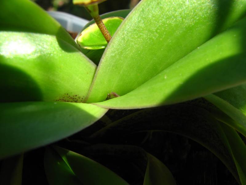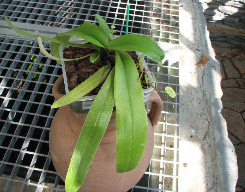 Moje Paphiopedilum spicerianum x sib ('Bostocks' x 'Wavy Gravy')je koupen v březnu na výstavě v Dráždanech 09. O jedné růžici od Ching Hua Orchids .Bylo v solidním stavu.Pafíčko má k mému překvapení velice tenoučké kořeny.Napadlo mě dát ho do nízké čtverhrané mističky .Substrát -coco chips+piniová kůra+pemza.Má jednu růžici původní,narostly dvě nové malé a jednu takovou pokřivenou -tu nepočítám. Pokles zimní k 13°C dostatek proudění vzduchu a vlhkost. Teploty vyšší v létě jsem se snažila aby nešly přes 30°C prostě jsem si udělala plán a toho jsem se řídila.Co to udělá. Něco- cosi vykukuje ze staré růžice. Mám potvrzeno od jednoho orchideáře že by to mohl být květ ,ale jsem nevěřící Tomáš a dokud to nebude víc patrné -nevěřím. Ale přeju si to .
