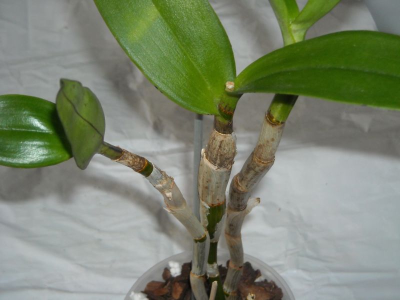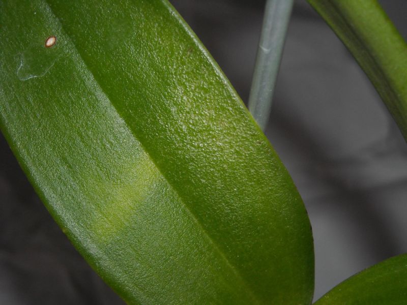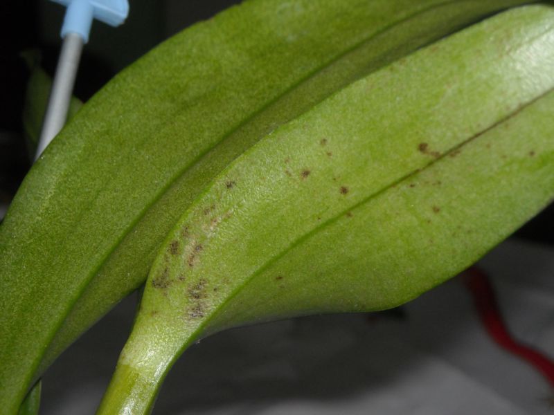 Na Dendrobiu phall. se objevila zřejmě houba, nejsem si jistá co to doopravdy je, skvrny na listech zespoda, svrchu je list jakoby zdrsnělý a matný a pahlízy jsou narezlé a potečkované viz foto.