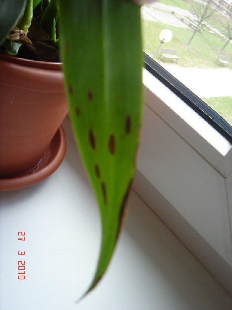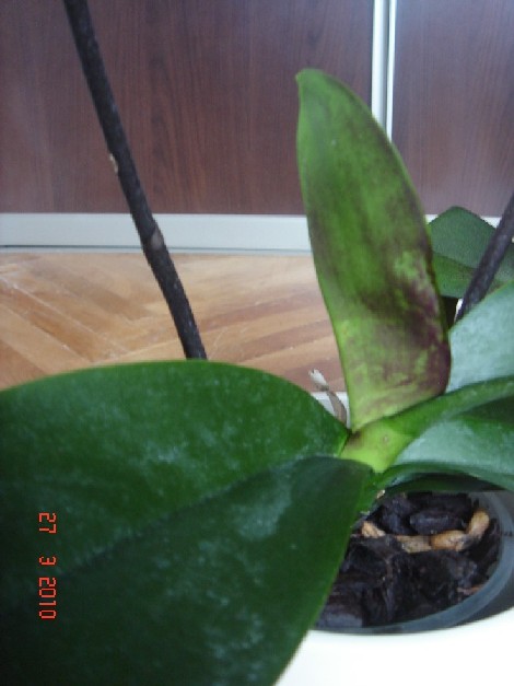 Phalaenopsis 1,2- rastlinka c.1 ma listy tvrde,druhej listy ovisli a zmakli ale na obidvoch mam nejake tmave flaky, zospodu su listy dokonca az tmavofialove. Su na nich aj male biele mapky, ale to si nie som ista, ci je nejaka choroba, ci to nie je iba tym, ze som ich zacala rosit a usadza sa na nich vodny kamen?