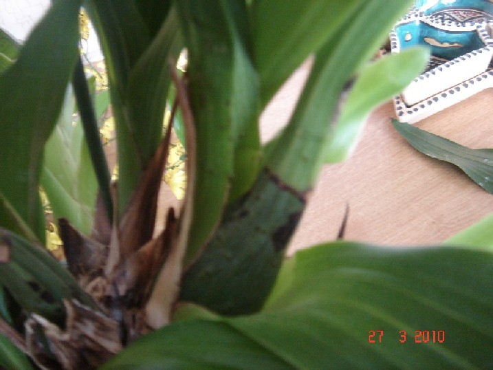Oncidium (teda nie som si ista, ci je to oncidium, iba si to myslim, prikladam preto fotku z casu ked kvitla)- na niektorych listoch sa objavili hnedo-cierne skvrny.