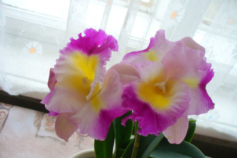 komu by bylo lito svych znicenych orchideji,tak posilam excelentne vyrizenou katleju.Stala 450 a je z lonske Fata Morgany.Nejdriv foto kvetouci,pak od trasnenky.Uz byla nekolikrat potirana Mospilanem,lihem,ale nic.Nastvalo me to- narostly nove pahlizy,ale ty jsou ted na odpis.Kvety byly uzasne.Koreny ma dobre.Tak uvidime.